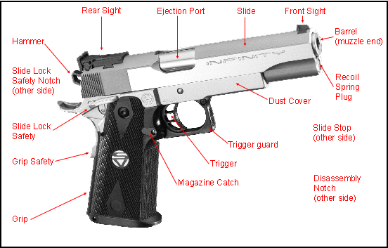 To open the action, you must pull back the bolt's operating handle (rifle or shotgun) or the slide (pistol).