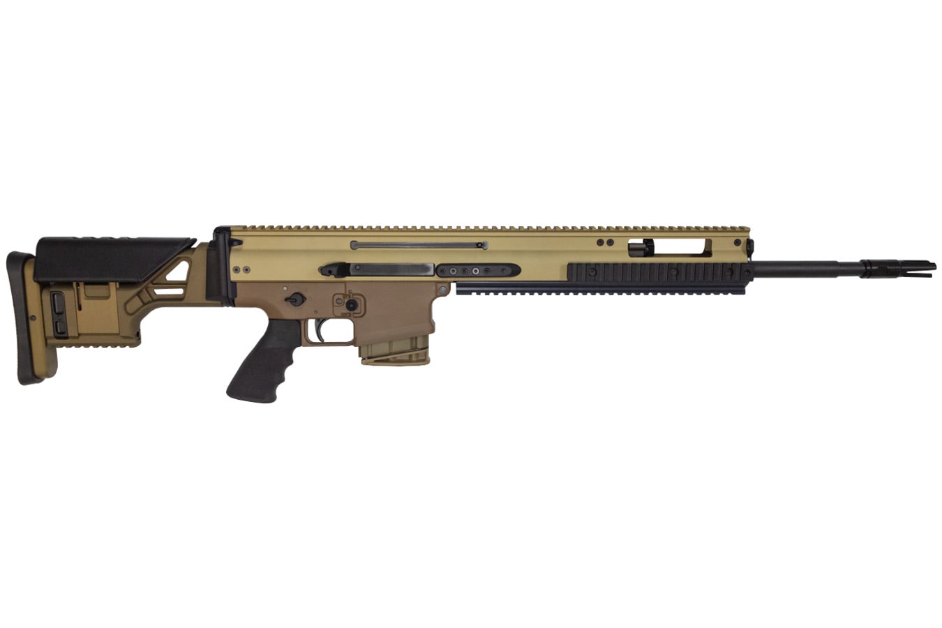 Take aim with the all-new FN SCAR 20S, the latest in battle-proven technology based on the legendary DNA of the 7.62-calibered MK 17 and MK 20 SSR. Perfectly calibrated for long-range precision fire, the SCAR 20S gives you the ability to engage targets nearing 800 yards with ease. The gas-operated piston design absorbs recoil efficiently to improve follow-up shots and maintain target acquisition. Lending further aid is the match-grade, two-stage trigger that breaks crisply at 3.5-4.5 pounds, full-length MIL-STD 1913 rail at 12 o’clock position, and fixed buttstock providing adaptability to fit to each user’s needs through adjustable length of pull and cheek rest height.