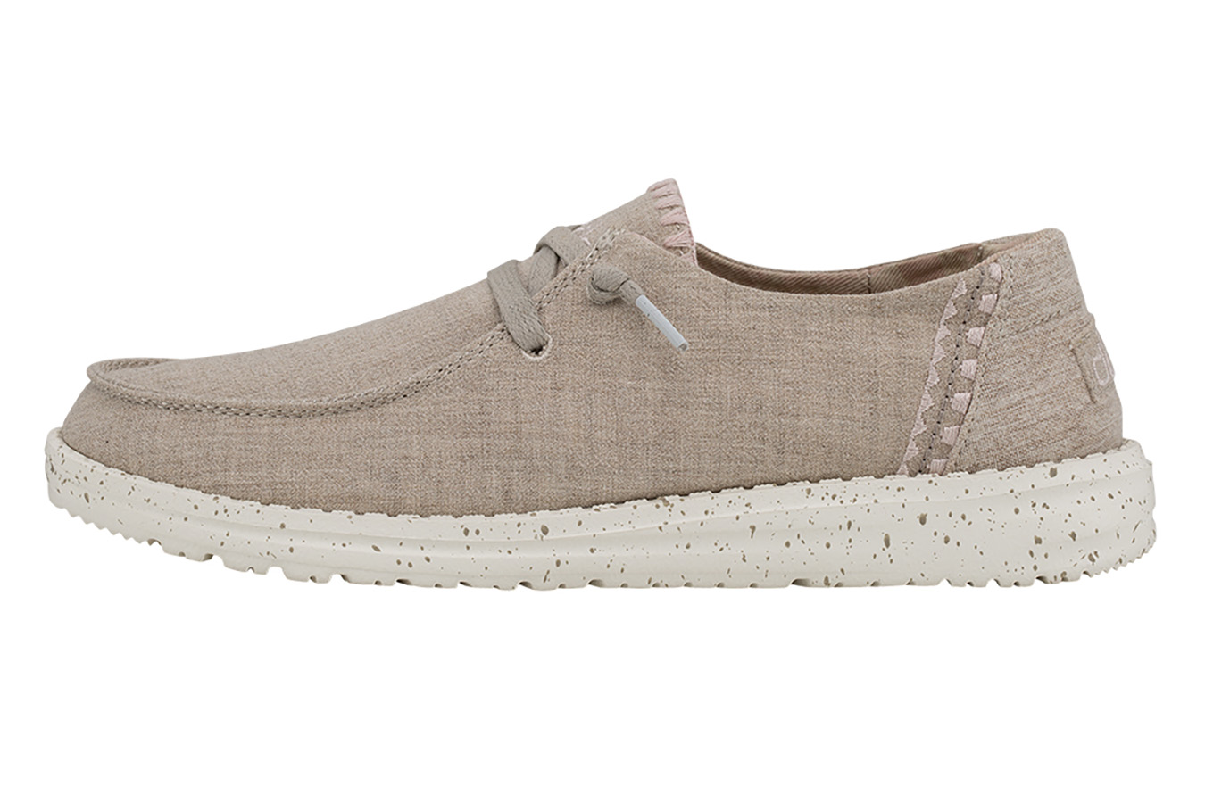 Hey Dude's iconic low-top moc. Soft, breathable cotton canvas. Easy-On elastic lacing system and their patented UltraLIGHT EVA outsole for extra comfort. Lined in bright prints for extra style points when you kick them off.