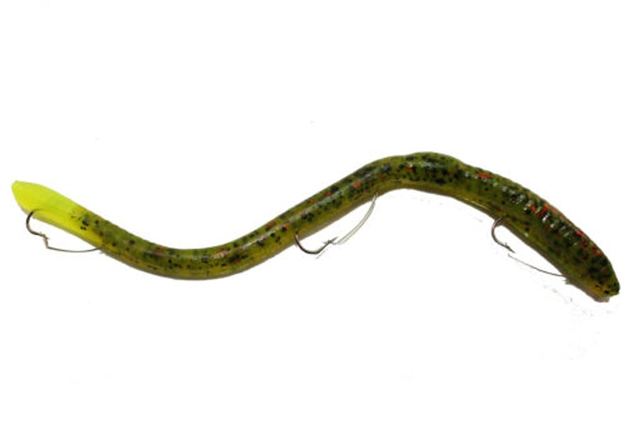 Skip an Ike-Con Big 8ight Pre-Rigged Worm under a pier, Carolina rig it, or simply cast and retrieve slowly. No matter how you fish it, this rigged-and-ready big worm yields rod-bending results. Its corkscrew-spiraling action is proven to trigger big strikes; infused with raspberry scent for even more fish-attracting power. Pre-rigged on 15-lb. mono with 3 super-sharp, weedless Mustad® hooks, including a stinger hook in the tail to catch those short strikers.