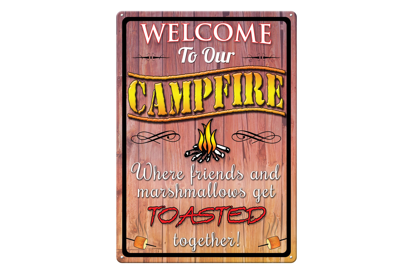 Welcome your campfire guests! This metal tin sign from River's Edge Products is ideal wall decor for campers and outdoor enthusiasts. The design features the message 'Welcome To Our Campfire, Where Friends and Marshmallows Get Toasted Together' in stylized capital letters over a woodgrain background. Its overall dimension measures 17 inches by 12 inches wide, has rolled edges and pre-punched corner holes for easy wall mounting. A durable weatherproof finish ensures that your sign will be protected from the elements. Customize your camper, firepit, or outdoor living space with this outdoorsy tin sign.