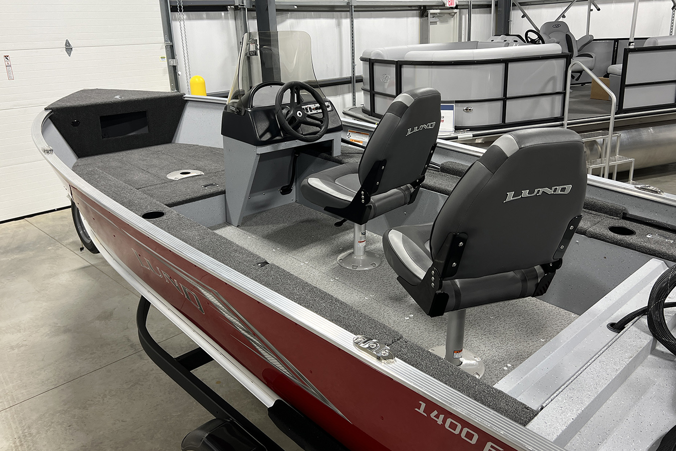 The affordable Lund 1400 Fury SS (side console) aluminum fishing boat features a convenient side console dual cockpit-side rod storage aerated livewell and a large bow casting deck. The 1400 Fury SS provides the ultimate convenience and power in a smaller sized 14 feet 9 inch side console fishing boat. The Fury is built with Lunds traditional quality and fishability.