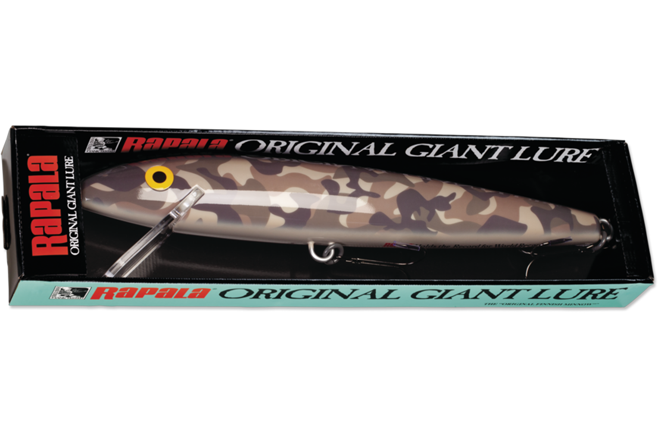 Instant storytelling erupts every time anglers get near this massive replica of Americas favorite lure. Makes a natural centerpiece in a woodsy bar setting, any basement, rec-room, log cabin or office. This 29" version of the Original Rapala® is packaged in giant Rapala® style cartons with legend story on back.