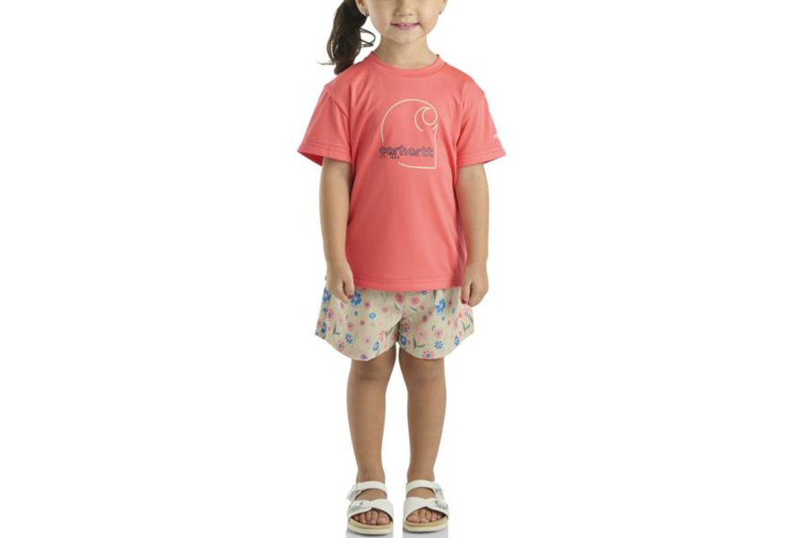 This toddler girls' two-piece outfit is a one-and-done thing. She can be outside for as long as she wants because the tee dries quickly and protects from the sun. Flowers and the Carhartt logo seal the deal.