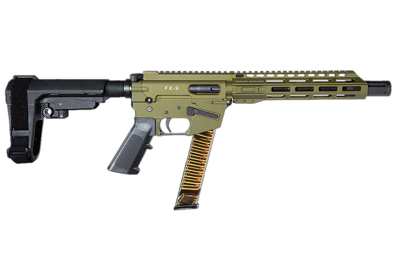 The Freedom Ordnance FX9P is a compact, AR-style tactical pistol chambered in 9mm Luger and built for high-capacity performance in a lightweight platform. Featuring a 10" steel barrel with a black nitride finish, a reliable blowback operating system, and an SB Tactical SBA3 brace, the FX9P delivers controllability and versatility. Finished with an OD Green anodized aluminum receiver and M-LOK handguards, this pistol is ready for customization and modern defensive or recreational use.