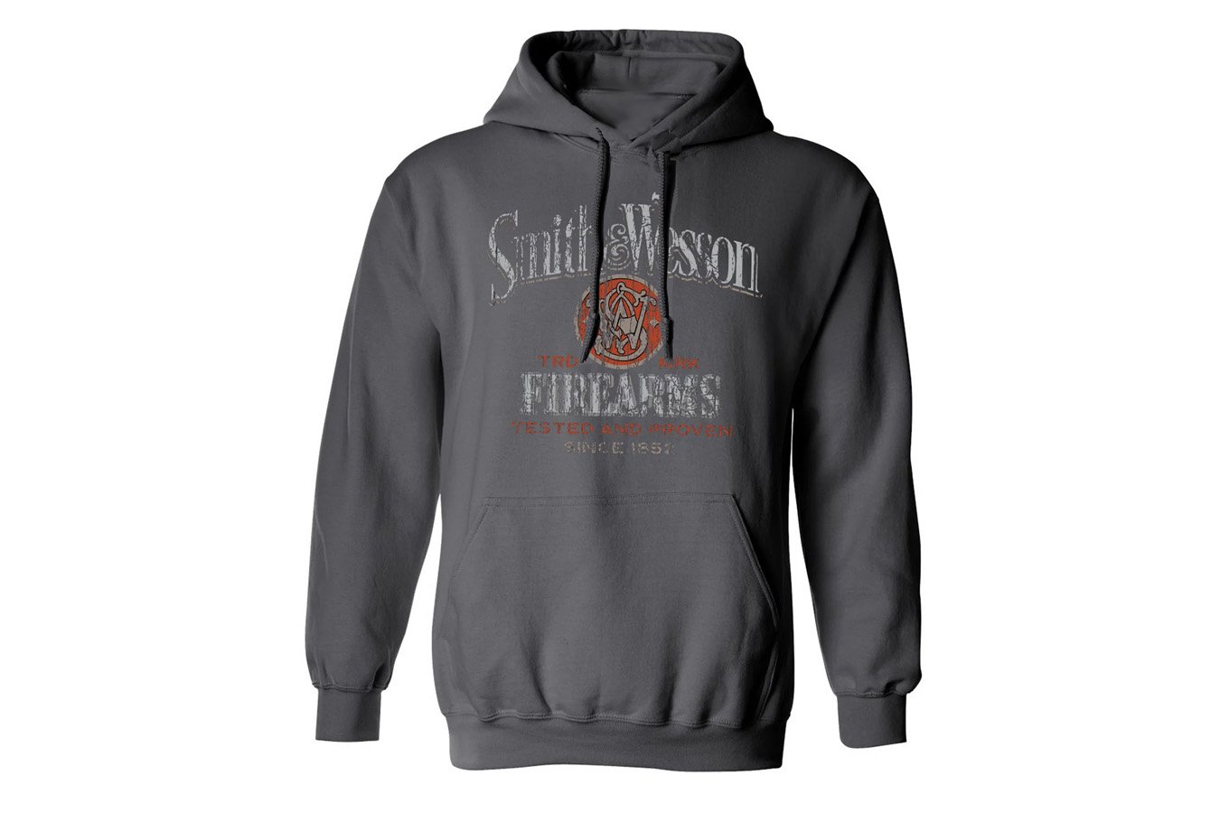 Smith & Wesson® Tested and Proven Graphic hoodie featuring a Smith & Wesson whiskey barrel style design. Empowering Americans since 1852, Smith & Wesson® graphic is soft-touch printed on this granite grey hoodie.