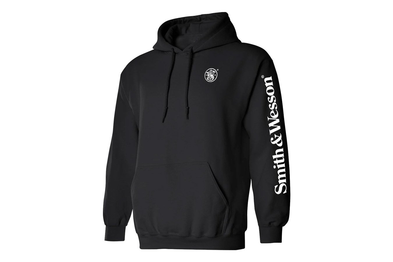 This is a long sleeve tee pullover hoodie with the Smith & Wesson logo on the sleeve and small logo on the front, left chest.