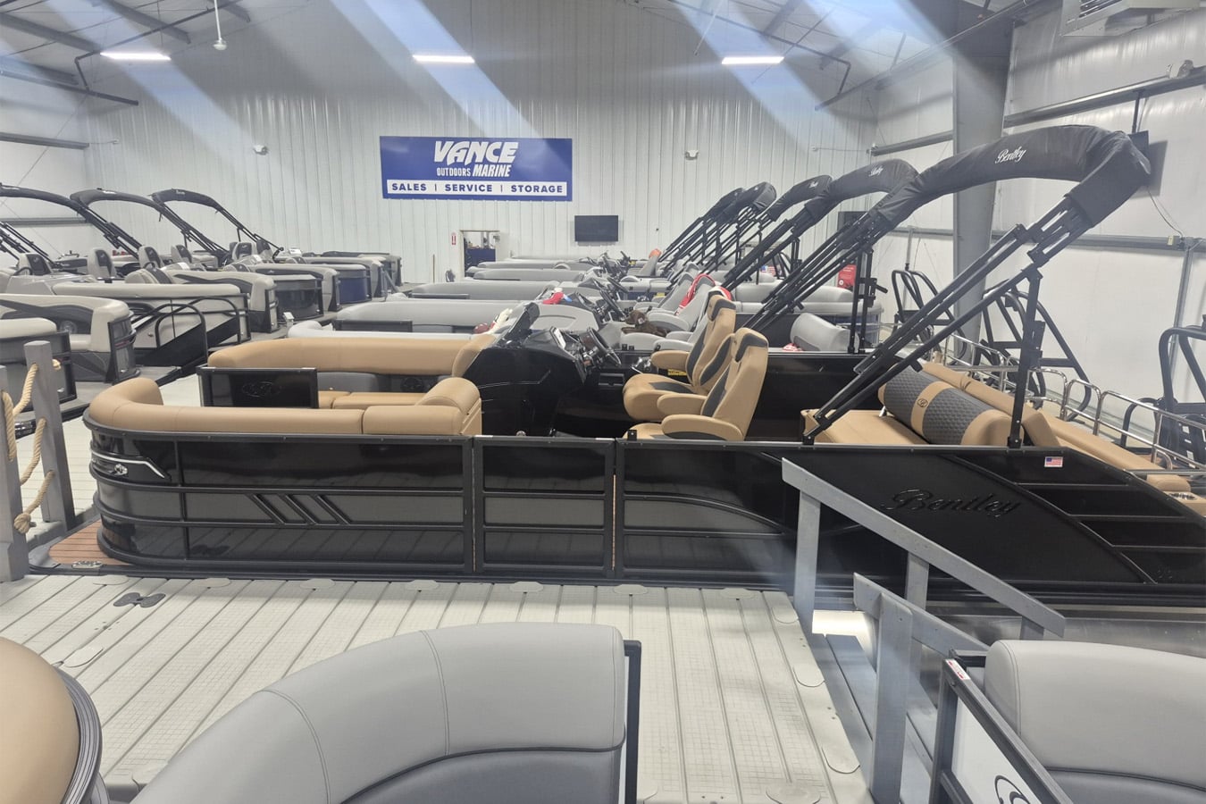 2026 Bentley Elite 223 Swingback Tritoon Pontoon & Mercury 4-Stroke EFI. This Matte Black Walls Tritoon 22' Swingback features front chaise lounge seating with storage, rear swingback lounge seating with multiple positions and storage, rear safety fencing, side-by-side highback reclining captain’s seats, interior blue LED package (lighted cup holders and courtesy lights), exterior blue LED light package with underwater and under deck lights, powder coated rails, stainless steel flip-up cleats, Simrad GPS touch screen gauges, Simrad GPS depth finder, ski tow bar, premium sound package with Bluetooth radio, six speakers and 10" subwoofer, wood grain table, raised fiberglass helm with storage, walnut teak vinyl flooring, playpen cover, hydraulic tilt steering, lifting strakes, underneath sheeting, Lillipad Easy Step ladder, 4 Fender Pro, LED docking lights, LED navigation lights, Brandy interior package, 25" tubes, wireless phone charger, multiple USB charging ports, lounge end table, new battery, electric bimini top, blackout package, black graphics package, EZ View bow gate, dog bowls, ski locker storage in tube, and a built-in 54-gallon gas tank.