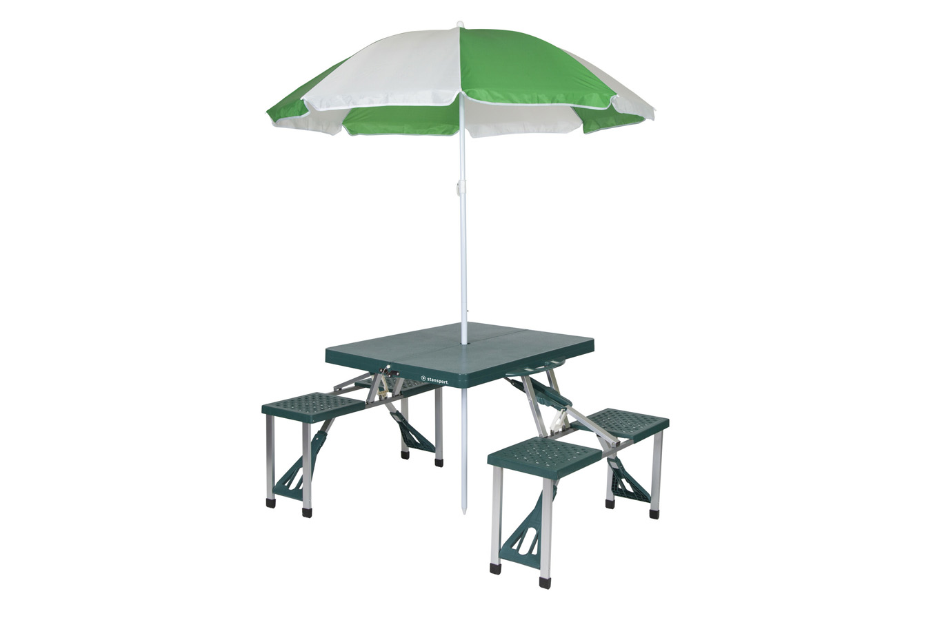 In need of the perfect table for your next trip outdoors? The Stansport® Picnic Table and Umbrella Combo is sure to do the trick. The 33.5" x 25.5" heavy duty high impact plastic tabletop construction makes this an essential for any occasion. Sturdy locking construction is built around durable anodized aluminum frame. This table is perfect for seating four happy campers with a fold out bench on each side of the table. Each bench has a weight limit of 200 lbs. To give you the ultimate picnic experience we’ve also included a UV protected umbrella that is adjustable up to 75” high. Setting up and tearing down has never been easier than with this picnic table! The whole unit folds down in on itself and stores inside of the tabletop, which then folds in half with the benches secured inside. And as an added bonus, we've included a built in carry handle on the side of the table for easy transport. Whether you are having a picnic, camping, hosting a tailgate, or having a backyard party, the Stansport® Picnic Table and Umbrella Combo makes entertaining a breeze!